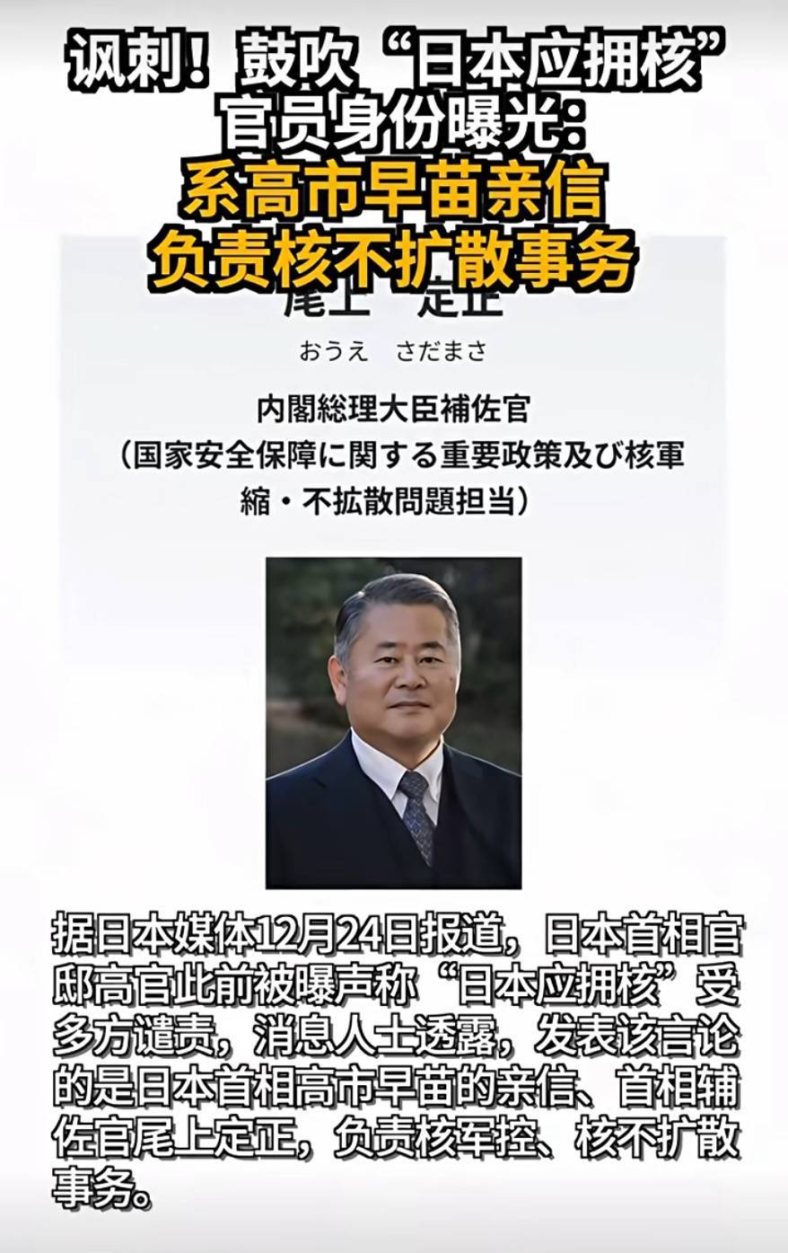 据参考音讯征引日媒24日报谈,近日,日本首相官邸高官被曝宣称“日本应拥核”,受到多方攻讦。音讯东谈主士夸耀,发表该言论的是日本首相高市早苗的心腹、首相辅佐官尾上定正,厚爱核军控、核不扩散事务。