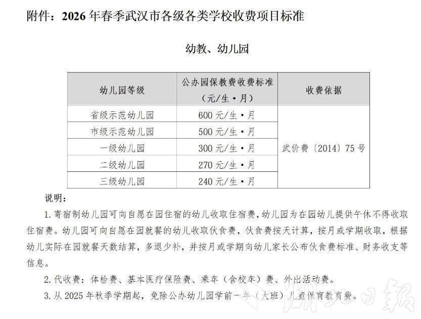 凭证公示实质,2026年春季,武汉市公办幼儿园保教费链接实行政府订价,其中省级示范幼儿园为600元/生·月,市级示范幼儿园500元/生·月,一级至三级幼儿园轮番为300元、270元、240元/生·月。义务纯熟阶段学校免收膏火、杂用,仅可按功令收取就业性收费和代收费,如伙食费、教辅材料费等,且必须遵照自发和非渔利原则。平方高中方面,省级及市级示范高中膏火设施为900元/生·学期,一般平方高中为630元/生·学期。